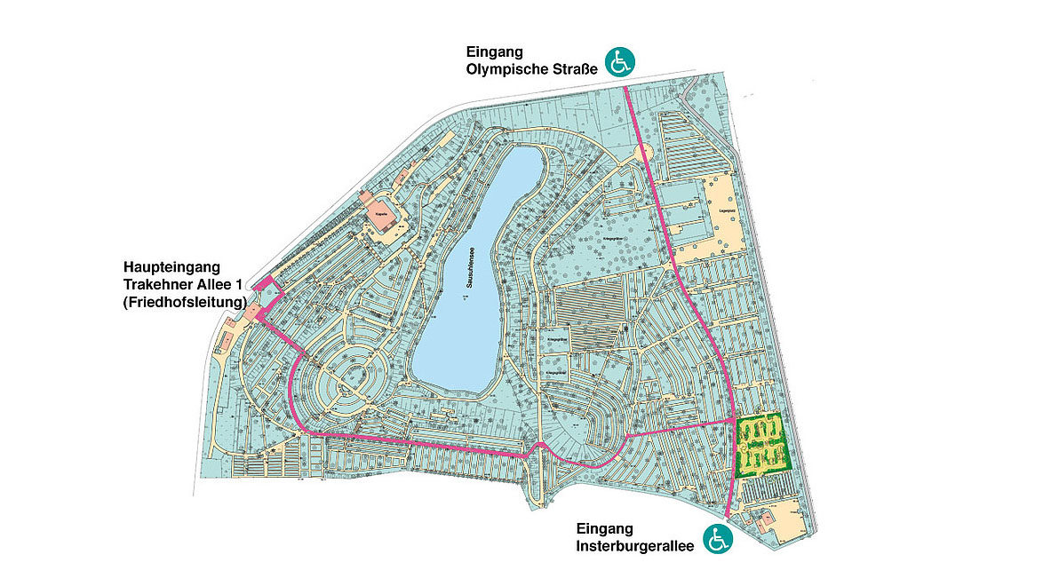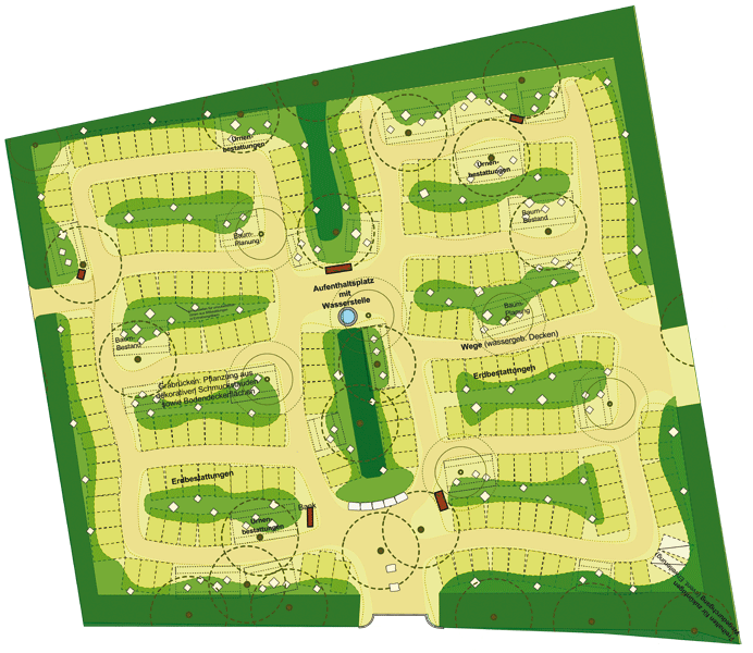 Die Grabfelder sind durch unregelmäßige Pflanzflächen getrennt. Zwischen den Grabreihen verlaufen geschwungene Wege. Ein beidseitiger Rasenstreifen begleitet die Wegeverläufe, sodass Besucher eine offene, überschaubare Anlage vorfinden.